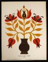DescriptionA silk screen print of a flower in vase design in red, brown, and mustard yellow on a white background. The text below the image reads: FROM A DOWER CHEST / 1804 / FOLK ART OF RURAL PENNSYLVANIA PLATE No. 5 INDEX OF AMERICAN DESIGN PENNA ART PROJECT W P A. On the reverse of the print is a line drawing and explanation of the 1804 chest from which the design was inspired.
