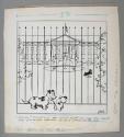DescriptionAn original black and white cartoon featuring Franklin D. Roosevelt's Scottish terrier dog, Fala. The cartoon is an outdoor scene showing a small scruffy dog and a puppy standing outside an iron gate through which can be seen Fala chasing a butterfly around the North Lawn of the White House with the North Portico of the White House visible in the background. The artist's signature is in the lower right corner of the cartoon: ALAN FOSTER. The caption is handwritten in pencil below the cartoon: "SEE JOE? THAT'S HIM. YOU WATCH YOUR Ps + Qs AND SOME DAY YOU MIGHT GROW UP TO BE A PRESIDENT'S DOG". The cartoon sheet has several publication notes written in pencil.