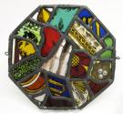 DescriptionAn octagon-shaped relic made from fragments of stained glass windows. The fragments of glass are joined by strips of lead. Two brass loops attached to the sides allow the piece to be hung.
