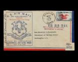 DescriptionA stamp cover commemorating National Air Mail Week in 1938. On the left side of the white air mail (par avion) envelope is a printed blue cachet consisting of the coat of arms of Connecticut. Blue and red text in the cachet reads: U. S. AIR MAIL / 20th ANNIVERSARY / CANAAN / The Growing End of the Nutmeg / STATE OF CONNECTICUT / NATIONAL AIR MAIL WEEK / MAY 15-21, 1938. Running along the left side of the cachet is the original ink signature of the Canaan postmaster: John N Marris PM.