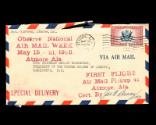 DescriptionA stamp cover commemorating National Air Mail Week in 1938. On the left side and lower right corner of the white air mail envelope is stamped red text that reads: Observe National / AIR MAIL WEEK / May 15 - 21, 1938./ Atmore, Ala. / SPECIAL DELIVERY / FIRST FLIGHT / Air Mail Pickup / at Atmore, Ala./ Cert. By [followed by the original ink signature of the Atmore postmaster: Jas. Y. Brown, p.m.].
