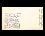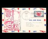 DescriptionA stamp cover commemorating National Air Mail Week in 1938. The white envelope has a printed border consisting of red and white, and blue and white, illustrations of planes, biplanes, hot-air balloons, and airships. On the left side of the envelope is a stamped red ink cachet featuring illustrations of man wearing a hat, an oil tower, and a mountain. Text in the cachet reads: LUDLOW / ♦CALIF♦ / ON OLD / SANTA FE / TRAIL / NATIONAL / AIR ♦ MAIL ♦ WEEK. Along the right side of the cachet is the original ink signature of the Ludlow postmaster: Vernie E. Sharradan P.M.