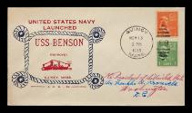 DescriptionA stamp cover commemorating the 1939 launching of the U.S. Navy destroyer, USS BENSON (DD-421). On the left side of the envelope is a blue and red stamped cachet consisting of an illustration of a Navy ship within a rectangular rope design with stars in each corner. Text on the cachet reads: UNITED STATES NAVY LAUNCHED / USS – BENSON / DESTROYER / QUINCY, MASS. / ----- R. C. D. • 70 ----.
