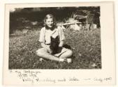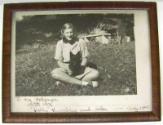 Label TextPresident Roosevelt kept this photo in his Study at the Roosevelt Library. It depicts his goddaughter, Margaret "Rolly" Hambley, with his dog, Fala. Rolly Hambley was the niece of FDR’s distant cousin, Margaret “Daisy” Suckley. A facsimile of the photograph is on display in FDR’S PRIVATE STUDY in the Permanent Exhibit.b) A 1/2" dark stained wood frame with glazing in which the photograph was originally displayed. The frame has a Masonite backer board with a metal easel stand. On the back of the frame is a framer's sticker for The Art Shop of Poughkeepsie, New York. The frame is stored separately from the photo.