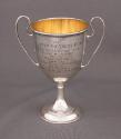 DescriptionA small, sterling silver Hyde Park Ice Yacht Club loving cup trophy. The trophy has a flared base, thin stem, a flared cup with a gold plated interior, and a handle on each side. Engraved text on the front reads: 1912 / HYDE PARK ICE YACHT CLUB / MARK W. REEVES CUP / • FOURTH • CLASS • / WON BY / HAWK / OWNED BY / HON. FRANKLIN D. ROOSEVELT / SAILED BY / WM. SMITH / DISTANCE 8 MILES, TIME 33 MIN. 35 SEC. Maker's marks on the underside of the base indicate the trophy was made by Thomas G. Brown and Sons for the Gorham Manufacturing Company. Additional information stamped into the underside of the base reads: STERLING / A4903 / 7/16 PINT.