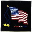 DescriptionA latch hook style commemorative pillow cover of an American flag on a background of black velvet. Sewn below the flag is a chain from which are suspended red, white, and blue plastic letters spelling: REMEMBER PEARL HARBOR.