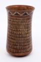 DescriptionA pottery vase. Depicted on the vase is a raised image of a human head topped by an elaborate headdress. Images of arms, a staff, and a shield are also seen. The rest of the vase is decorated with geometric design around the top, and a patterned surface.