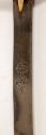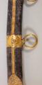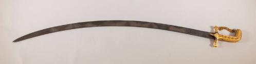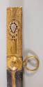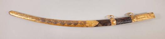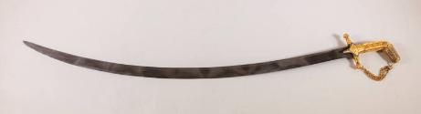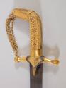 Descriptiona) An Arabian saif (also scimitar). The curved blade of the sword is made of steel and has Arabic markings on one side. The bone guard, hilt, and curved pommel are covered in chased gold, gold filigree, and gold thread. Gold chains connect the pommel to the guard. Each side of the hilt has a row of four clusters, each cluster containing seven diamond-shaped gold pieces.