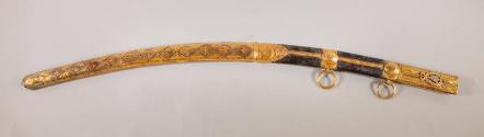 b) A leather scabbard partially covered with chased gold and gold filigree and set with 33 various sized diamonds. Two carrying rings are attached along one edge of the scabbard's throat.