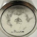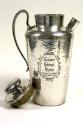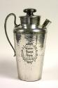 DescriptionA commemorative silver-plated cocktail shaker. The shaker has removable cap (a) made of cork and topped with a silver-plated knob handle. The shaker itself (b) has a spout for pouring and a handle. Engraved on the side of the shaker is an octagon in which is an inscription that reads: FELLOWSHIP / DESERVES / REUNION / JANUARY TWENTY SEVEN / NINETEEN TWENTY FOUR. On each side of the octagon are engraved initials (from top going counterclockwise):