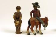 Label TextIn April 1942, Secretary of Commerce Jesse Jones gave Franklin D. Roosevelt these carved wood figures of Adolf Hitler and an American cowboy. The figures were created by Herbert S. ("Andy") Anderson of Topanga, California.The multi-colored carving of the cowboy, seated on a brown horse, shows him wearing a plaid shirt, denim pants, boots, spurs, and a broad-brimmed hat. In his right hand he holds one end of a rope that is tied around the neck of Hitler at whom he is looking back at.