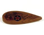 DescriptionA small, carved, wooden airplane wing. On the left half of the face of the wing is an outline image of a Polish Air Force aviator badge insignia consisting of an eagle clutching a wreath in its beak over a red and transparent checkerboard. To the right of it is another WWII insignia, an Army Airforce insignia consisting of red circle within a transparent star on a circular blue background. On the right half of the wing is an inscription in black text that reads: To / Mr. / F.D. Roosevelt / From / Polish Airman / 4.7.1942.