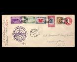 Label TextFranklin Roosevelt was an avid, lifelong stamp collector who gathered over 1.2 million stamps into his personal collection during the course of his life. He began collecting stamps at the age of eight at the suggestion of his mother, Sara Delano Roosevelt, who passed on her collection to him.The envelope is addressed to (handwritten in ink): F.D. Roosevelt, Pres., of U.S.A. / Washington, / D. C. Along the top of the envelope are five adhered U.S. postage stamps, and one preprinted U.S. postage stamp: a 1937 bright violet 3¢ Territorial Issue (Puerto Rico) postage stamp (Scott 801); a 1937 green 20¢ China Clipper air mail postage stamp (Scott C21); a 1938 dark blue and carmine 6¢ Eagle air mail postage stamp (Scott C23); a 1936 red and blue 16¢ Special Delivery air mail postage stamp (Scott CE2); a 1930 brown 4¢ Taft postage stamp (Scott 685); and a carmine 2¢ preprinted George Washington postage stamp. The envelope is postmarked Jefferson, Ohio, May 19, 1938.