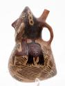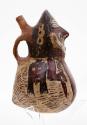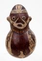 DescriptionA pottery bottle in the shape of a human figure, possibly a warrior, with a protruding nose and ears. Images of human heads are visible on either side. A single spout and handle is on one side of the bottle, and the bottom of the bottle is rounded.