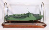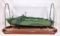 DescriptionA model of a 78 foot Patrol Torpedo (PT) boat built to exact scale (1/2" = 1 ft). The wooden boat has a green and brown painted hull. The model is mounted on a small wooden base affixed within a plastic, metal, and wood case. A brass plaque attached to the port side of the model's base is inscribed: 78 FT. HIGGINS MOTOR / TORPEDO BOAT.