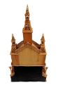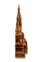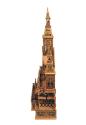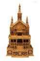 DescriptionAn elaborately carved wooden clock case made entirely out of wooden grocery boxes. The carving represents the façade of a church with three spires, each with a small metal bell. Below the center spire is a non-working clock face with hands (the clock mechanism was not installed). The back side of the model is partially covered in wood, and partially in fabric.
