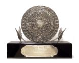 DescriptionA silver reproduction of the round, 16th century Aztec Calendar Stone, or Sun Stone. It is mounted on a rectangular black marble base and flanked by two silver eagles. Attached to the front of the base is a silver plaque with an engraved inscription that reads: "PIEDRA DEL SOL" / AL / PRESIDENTE ROOSEVELT / DEL / PRESIDENTE AVILA CAMACHO / MEXICO SEPTIEMBRE-1942.