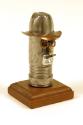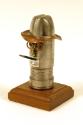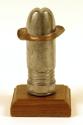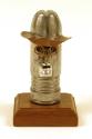 DescriptionA small metal caricature figurine of Franklin D. Roosevelt made from an artillery shell. Pieces of copper and metal adhered to the shell form the face, eyeglasses, cigarette holder, and hat. The figurine is mounted to a wooden base along the back edge of which are the names of the makers written in pencil: Dr. Bernie Cooper + Steve Jancer.