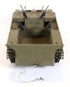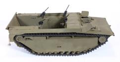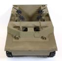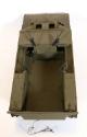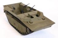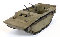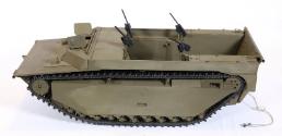DescriptionA scale model of a fully equipped Tracked Landing Vehicle, or Water Buffalo. The metal model is painted Army green and has an electric motor and several moving parts, including doors and guns. A silver-painted rope with anchor hook is tied to the rear.
