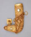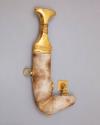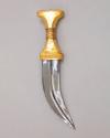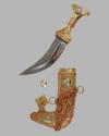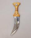 Descriptiona-b) An Arabian janbiya dagger and scabbard. The curved blade of the dagger is made of steel and the hilt is made of hammered gold and gold filigree. Set into the hilt of the dagger is one large diamond encircled by eight smaller diamonds. A larger diamond, originally set lower on the hilt, is now stored separately. The leather-backed scabbard is also made of hammered gold and gold filigree, and is interspersed with thin gold roping tied between gold rings. Set into the scabbard are two large diamonds.