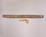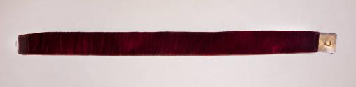 c) A dark red velvet dagger belt, elaborately decorated on the front with gold and silver metallic thread, sequins, and beads. One end of the belt holds the metal buckle, and the other end the metal loop.