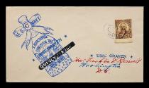 DescriptionA stamp cover commemorating the February 25, 1937 christening of the U.S. Navy destroyer, USS CRAVEN (DD-382]. On the left side of the envelope is a stamped blue ink cachet consisting of an illustration of a champagne bottle with an image of a ship launching on the bottle label. Text on the bottle reads: U. S. / C / NAVY / LAUNCHING / “I CHRISTEN THEE” / USS CRAVEN / DD 382. A black band with white text that crosses over the lower part of the bottle has the words “QUINCY, MASS.” written on it.