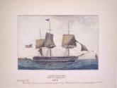DescriptionA hand-painted photographic print of an engraving of the USS NORTH CAROLINA from a painting by Nicola Cammillieri. The image depicts a three-masted, 74-gun sailing ship in open water. Visible in the right background are several other sailing ships in the distance. To the left of the ship is a rowboat, and in the distant background, a fort. The inscription "13-9-4" appears in the lower left corner of the image, and the hand-lettered inscription "U.S.S. North Carolina, 1827" (possibly FDR's handwriting) in the lower right corner.