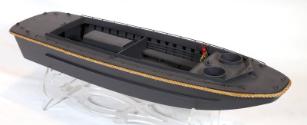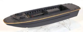 DescriptionA scale model of a Landing Craft Personnel (Large) boat, or LCP(L). The wooden boat is painted dark gray, has a top edge bordered by roping, a brass ship's wheel, a red fire extinguisher, and a brass propeller and rudder at the bottom stern. The interior bottom of boat has access hatches covered by five removable panels. The model rests on a clear plastic cradle stand.