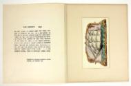 DescriptionAn original watercolor painting of a ship carver's sign. It shows a three-masted ship in full sail, surrounded by an elaborately carved scroll work painted gold. The painting is matted within a paper folder. On the page opposite the painting is information text regarding the figurehead.
