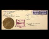 DescriptionA stamp cover commemorating the 1938 U.S. air mail first flight from Juneau to Fairbanks, Alaska. In the lower portion of the white envelope is a stamped purple ink cachet consisting of an illustration of an airplane flying over a scene, flanked by totem poles, of a body of water with mountains in the background. Text above and below the illustration reads: UNITED STATES / Air Mail / JUNEAU – FAIRBANKS/ first flight. On the left side of the envelope is an embossed gold foil seal for the Territory of Alaska. Typed along the top of the envelope: First Flight – JUNEAU TO FAIRBANKS.
