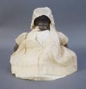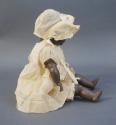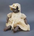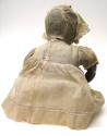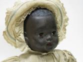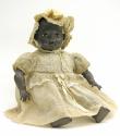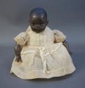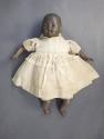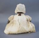 DescriptionA Saralee [also known as "Sara Lee"] black baby doll. She is wearing a white fabric dress with linen underdress and bloomers, and on her head is a white fabric bonnet with blue trim. The body of the doll is made of vinyl and fabric-covered cotton stuffing, and the "hair" is molded and painted. When the doll is laid down her eyes close, and when she is turned over she makes a crying sound.