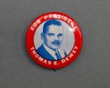 DescriptionA round pinback button from Thomas Dewey's campaign. At the center, on a blue halftone background, is a blue halftone photographic image of Dewey. Encircling the edge of the button is a broad red band on which is white text that reads: FOR PRESIDENT / THOMAS E. DEWEY.