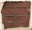 DescriptionA large, heavily rusted metal fragment cut from a section of the aft deckhouse superstructure of the USS Arizona (BB39). A pipe segment (in two pieces) runs horizontally along the front of the fragment.