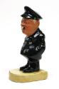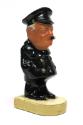 DescriptionA painted plaster caricature figurine of Winston Churchill. Churchill is shown standing on a low base with his hands tucked into his pockets. He is wearing a navy blue outfit consisting of a double-breasted pea coat with gold-painted buttons, pants, shoes, and a brimmed cap. A cigar is in his mouth.