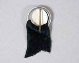 DescriptionA round ca. 1936 pinback campaign picture button that has been repurposed as a 1945 memorial piece. At the center is a black and white photographic image of Franklin D. Roosevelt encircled by a white border. Attached to the reverse of the button is a length of black ribbon that hangs down below the button.