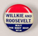 DescriptionA round pinback button from the 1940 campaign for political rivals Franklin Roosevelt and Wendell Willkie. The button consists of three horizontal bands in red, white, and blue. Blue and white text reads: “WILLKIE AND ROOSEVELT / MAY THE BEST MAN WIN.” The manufacturer's information is printed on the rim of the button.