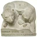 DescriptionA badger carved from stone. The badger is crouching down on the ground with three beetles on the ground around it. Etched on the front side: BADGER STATE TO / PRESIDENT FRANKLIN D. ROOSEVELT. Etched on the left side: MILWAUKEE WIS. / W.P.A. PROJECTS 1670-2210. Green felt liner on underside. The piece was sculpted by Richard Bolmes and carved by Paul Schwade.
