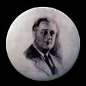 DescriptionA round pinback campaign picture button. At the center of a white button is a black and white reproduction of a Jacob H. Perskie pencil drawing of the head and shoulders of Franklin Roosevelt. Just visible in the lower left of the button is text that reads: Franklin / Delano / Roosevelt. The manufacturer's information is printed on a label inserted on the reverse of the button.