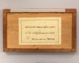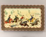 DescriptionA miniature painting on ivory. It depicts the figures of Stalin, Churchill, Roosevelt, and Chiang Kai-shek, all in Persian dress, riding horseback. They are in pursuit of three similarly-clad figures representing the Axis powers (Italy, Germany, and Japan). The painting is signed by the artist in the lower right quadrant. The piece is within a mosaic frame with a note in Iranian Arabic pasted on the reverse.