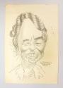 DescriptionAn original caricature portrait of Eleanor Roosevelt drawn in graphite pencil with a touch of red pencil at the gums. The portrait consists of an exaggerated head, neck, and shoulders view of Eleanor, turned slightly to the right of the page. On her shoulder is some sort of collared top, and around her neck is a single strand pearl or bead necklace. To the right of the portrait is the artist's signature and address written in pencil: PAUL BINDER / 6266 SUNSET BLVD., / HOLLYWOOD, / CALIF.