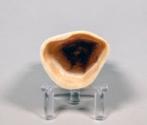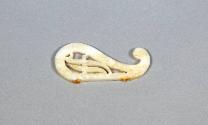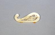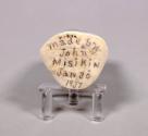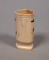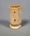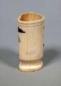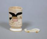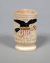 DescriptionA small commemorative scrimshaw cup carved from what is likely a piece of walrus tusk. On the side of the handled cup (handle now detached) is a multicolored etched and painted image of a bald eagle, with wings outstretched, perched on a patriotic stars and stripes shield backed by arrows. Text etched above and below the image reads: USA /St Paul / PRIBILOF ISLANDS. / ALASKA. Hand inscribed on the underside of the cup's base is the maker's information: Made by / John / Misikin / Jan 30 / 1937.
