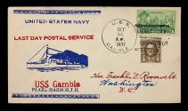 DescriptionA stamp cover commemorating the 1937 decommissioning of the U.S. Navy destroyer, USS GAMBLE (DM-15). On the left side of the envelope is a blue and red stamped cachet consisting of a small illustration of a Navy ship with text that reads: UNITED STATES NAVY / LAST DAY POSTAL SERVICE / USS Gamble / PEARL-HARBOR, T.H.