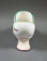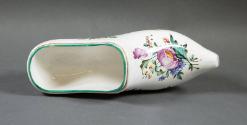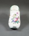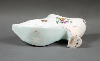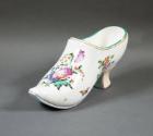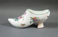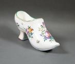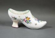 DescriptionA knickknack in the form of a glazed ceramic heeled shoe decorated with colorful hand-painted flowers and butterflies. The body of the shoe is white with a beige heel and a mint green sole.