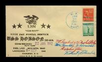 DescriptionA stamp cover commemorating the 1942 commissioning of the U.S. Navy destroyer, USS HOBSON (DD-464). On the left side of the envelope is a raised gold cachet with an image of an eagle on a patriotic shield flanked by stars. Text below the image reads: USN / “OUR NAVY” / FIRST DAY POSTAL SERVICE / USS HOBSON DD 464 / COMMISSIONED NAVY YARD 22 JAN 1942 / KEEL LAID NOV. 14TH. 1940 / LAUNCHED 8 - SEP 1941 / CHARLESTON, S. C. / R. C. D. 70.
