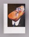 DescriptionA binder sheet page featuring a color print of a drawn caricature portrait of Franklin D. Roosevelt. Angled on a black background is FDR's head with an exaggerated chin. Perched on his nose is a pair of pince-nez glasses, and a white shirt collar and blue and white striped necktie are visible below at his neck. The artist's facsimile signature is the lower right of the caricature: Vicky.