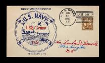 Additional DetailsThe envelope is addressed to (handwritten in red and blue ink): Hon. Franklin D. Roosevelt / Washington / D. C. Adhered in the upper right corner of the envelope is a U.S. 1930 brown 1½¢ Warren G. Harding stamp (Scott 684). The envelope is postmarked U.S.S. GREER, January 13, 1937, with a "LAST DAY IN / COMMISSION" cancellation.