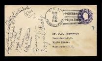 Additional DetailsThe envelope is addressed to (typed): "Mr. F.D. Roosevelt / President. U.S. / White House. / Washington, D.C." There is no return address. In the upper right corner of the envelope is a preprinted U.S. purple 3¢ George Washington postage stamp (Scott U93). The envelope is postmarked U. S. S. PENNSYLVANIA, May 20, 1936 with a "CROSSING EQUATOR" cancellation.