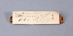 DescriptionA sliver of wood from the steam frigate, USS MERRIMACK (1855). Tied to the piece of wood with string is a cardstock label on which are two handwritten messages in ink (in different hands). One message reads: armor plated / "Merrimac" / 1862. The other message reads: To E. D. [Edward Delano?] from / Rich. Williamson. / 1862.