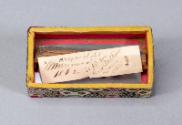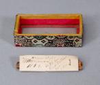 Label TextThe steam frigate USS MERRIMACK (1856-1861) - sometimes incorrectly referred to as the USS MERRIMAC - was completed in 1855 at the Boston Navy Yard. Commissioned in 1856, the ship was for a time the flagship of the Pacific Squadron. After its decommission in 1860, the MERRIMACK was burned and sunk by Federal forces the following year while anchored at the Norfolk Navy Yard, Virginia. The Confederacy salvaged the ship and converted it to an armored ironclad, commissioned as the CSS VIRGINIA in 1862.The wood sliver is stored in the cover of a small box which has a woven fabric surround with clear glass insert in the center.