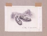 DescriptionAn original pen and ink and ink wash drawing with gouache highlights of a pair of baby shoes (see MO 1947.84.38) worn by Franklin D. Roosevelt. The drawing is signed by the artist in ink in the lower right below the image: Olin Dows © 1949. Pencil measurements are written in the right margin of the artwork page. A tag for the drawing, which has separated from it, reads: 7. Baby Shoes.